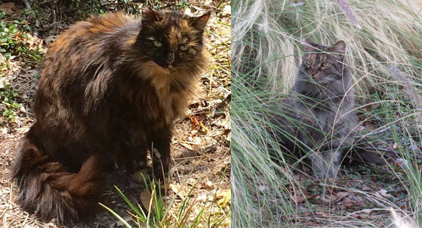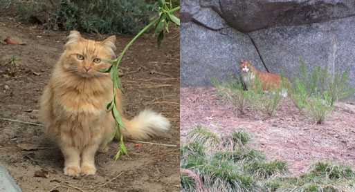 Francisco (left) hangs out at Grizzly River Run in California Adventure, and is one of the friendliest of Disneyland’s feral cats. He’s been known to come near the fence to give park guests excellent photo-ops. His** friend (right) came out too, but stayed at a distance in camouflage.