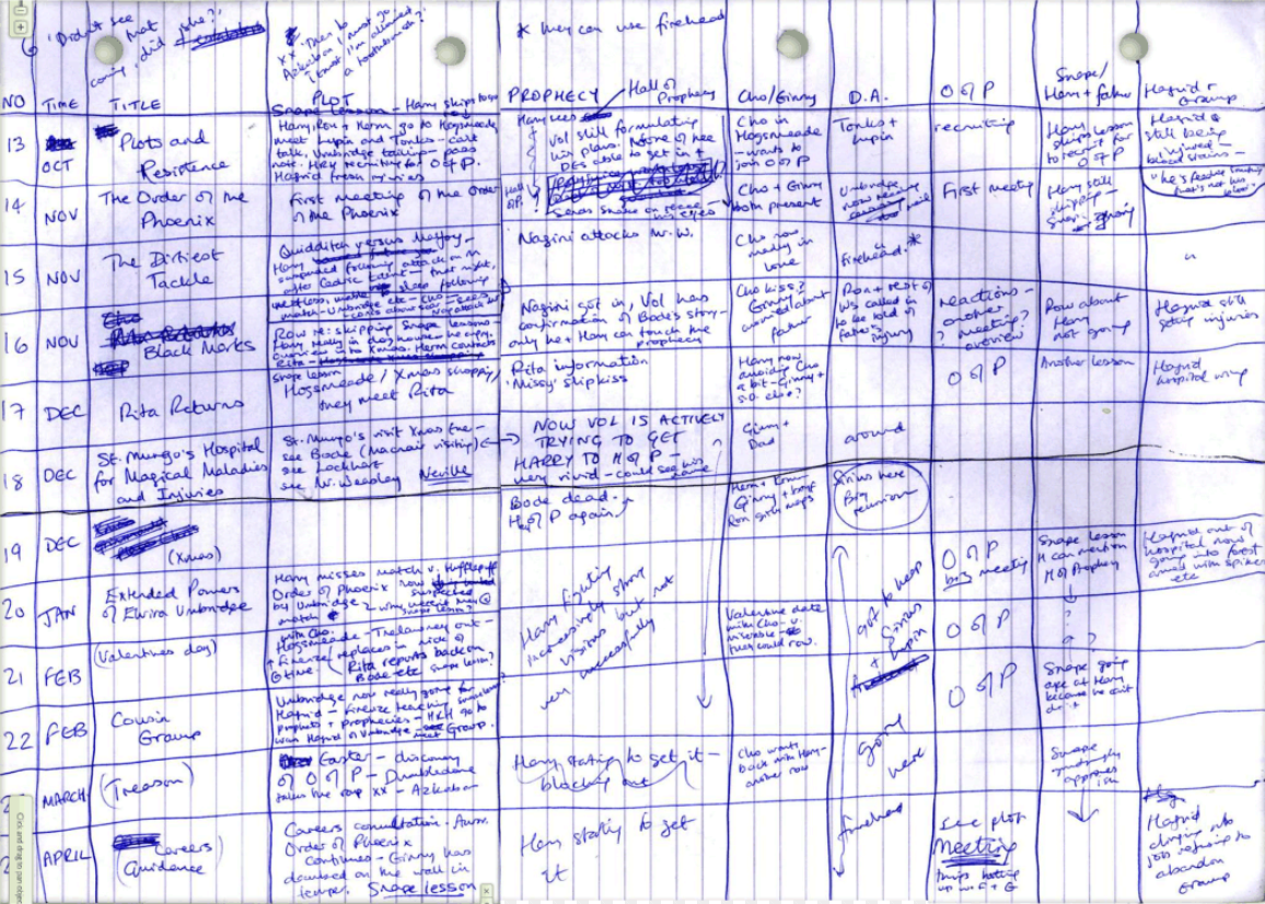 Writing a novel requires tracking story structure, character traits and arcs, setting and world building details. And maybe more! JK Rowling created an overall spreadsheet for the Harry Potter series, as well as spreadsheets for each individual book. The following image is of Rowling’s hand drawn spreadsheet for Harry Potter and the Order of the Phoenix.